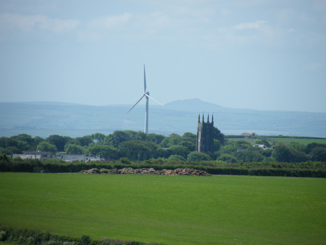 This photo shows the wind turbine built close to the Grade 1 listed Church of St James, Kilkhampton as viewed from the A39.