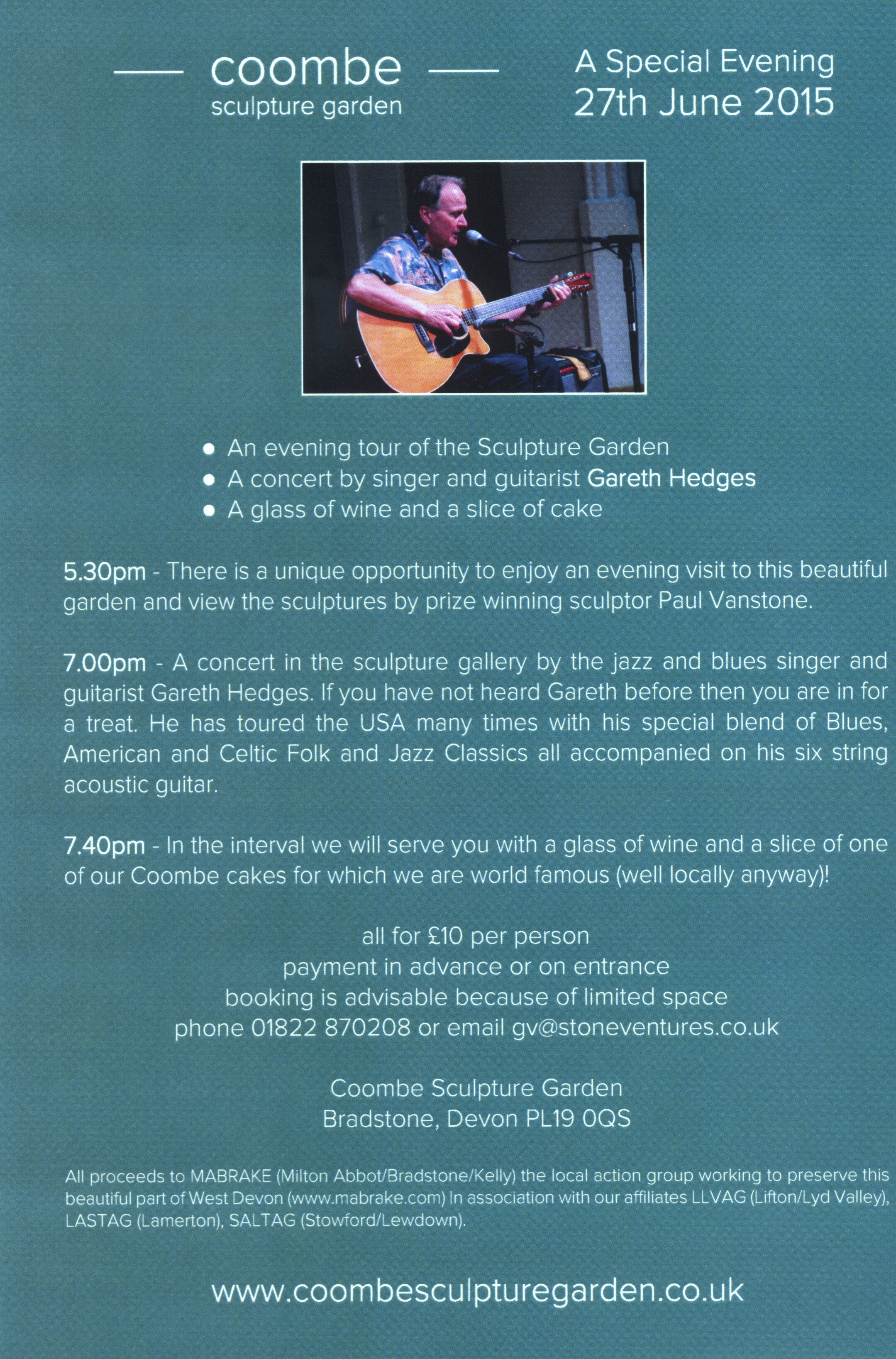 At 7.0pm a concert will be given in the Sculpture Gallery by the jazz and blues singer and guitarist Gareth Hedges. Gareth has toured the USA many times where he is very popular so if you haven’t heard him before then you are in for a treat!